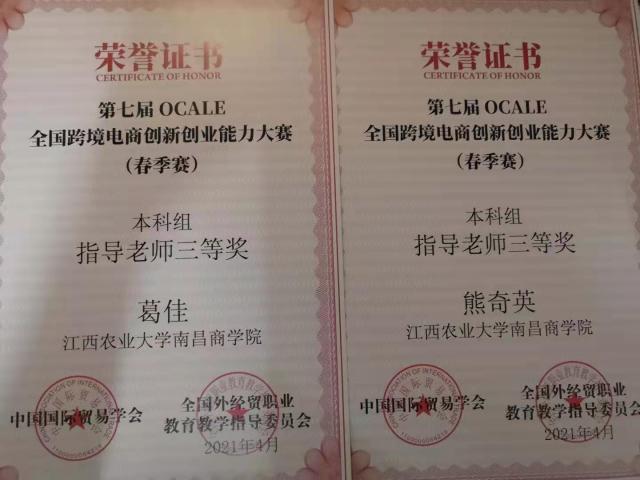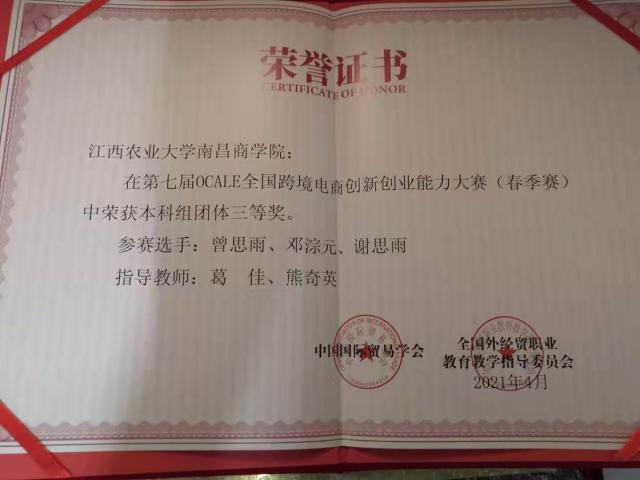 近日,由中国国际贸易协会、全国外经贸职业教育指导委员会主办的第七届OCALE全国跨境电商创新创业能力大赛圆满落幕。我院经济系代表队表现出色,取得可喜成绩,荣获三等奖。