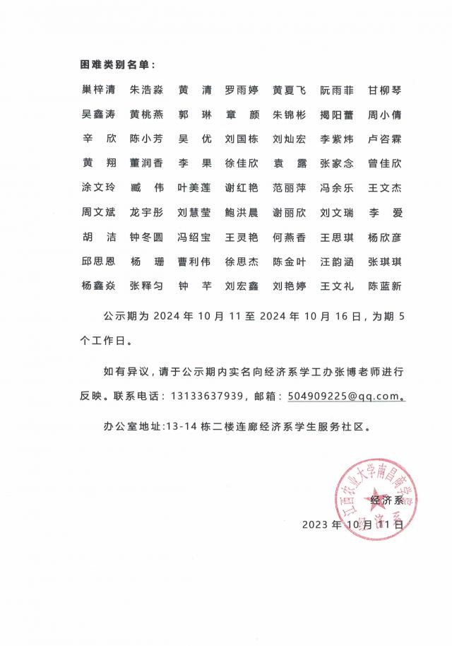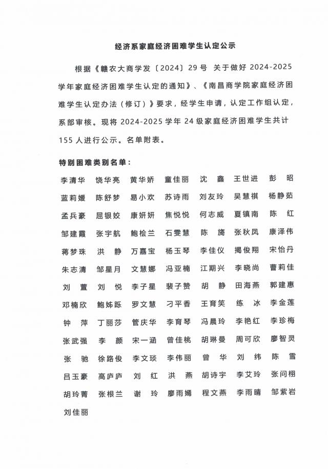 经济系2024-2025学年家庭经济困难学生认定公示(2024级新生)